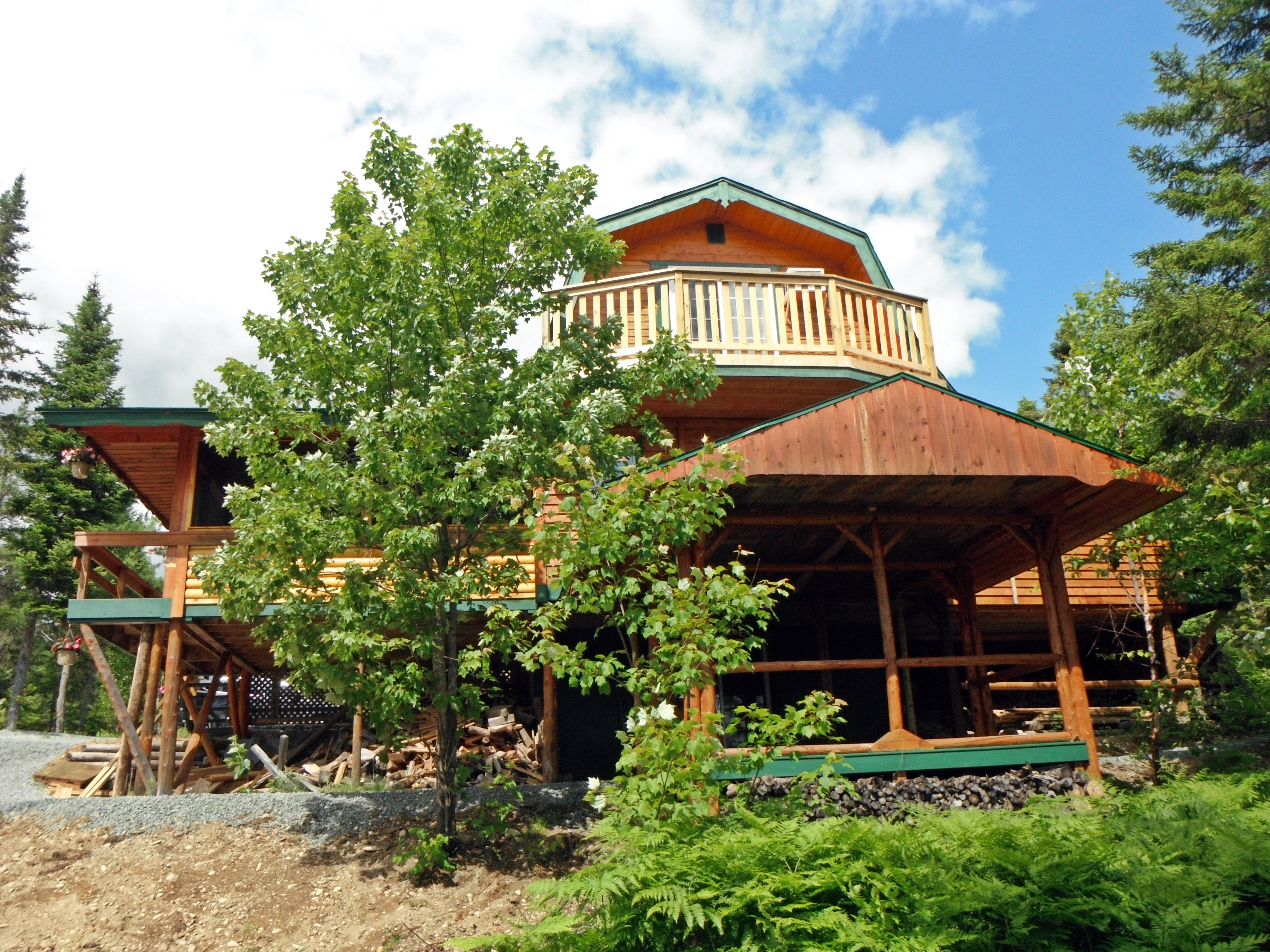 Die Lodge steht nicht direkt am Wasser, sondern in einem schönen Mischwald bestehend aus Tanne, Fichte, Kiefer, Birke und Ahorn. Dies bietet den Vorteil, dass man gut ohne Mückenschutz auf der offenen überdeckten Veranda (Porch genannt) verweilen kann. Unten am Fluss hingegen, sollte man spätestens bei Dämmerung einen Mückenschutz auftragen. Auf dem unteren Porch steht ein Holzkohle-Grill zur Verfügung. Diesen bitte bei Benutzung ins Freie stellen und nicht unter der Überdachung in Betrieb nehmen.